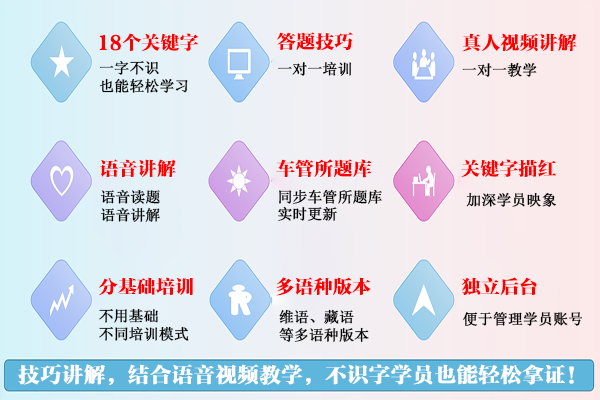 車龍頭交規(guī)是一款專業(yè)的文盲駕考理論速成軟件,采用技巧培訓(xùn)學(xué)員,只要學(xué)員記住18個(gè)核心關(guān)鍵字。不管學(xué)員識(shí)不識(shí)字,記性好不好,都能輕松培訓(xùn)學(xué)員通過(guò)科一科四理論考試。技巧簡(jiǎn)單,軟件題庫(kù)全,可快速培訓(xùn)學(xué)員。 軟件試用 →